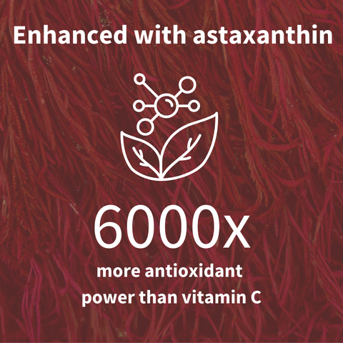 Our algae oil is enhanced with astaxanthin, a potent antioxidant derived from H.pluvialis microalgae. Astaxanthin has 6000 times more antioxidant power than vitamin C, and is also provided in a complex of 3 antioxidants. The natural extract used also provides lutein and Zeaxanthin.