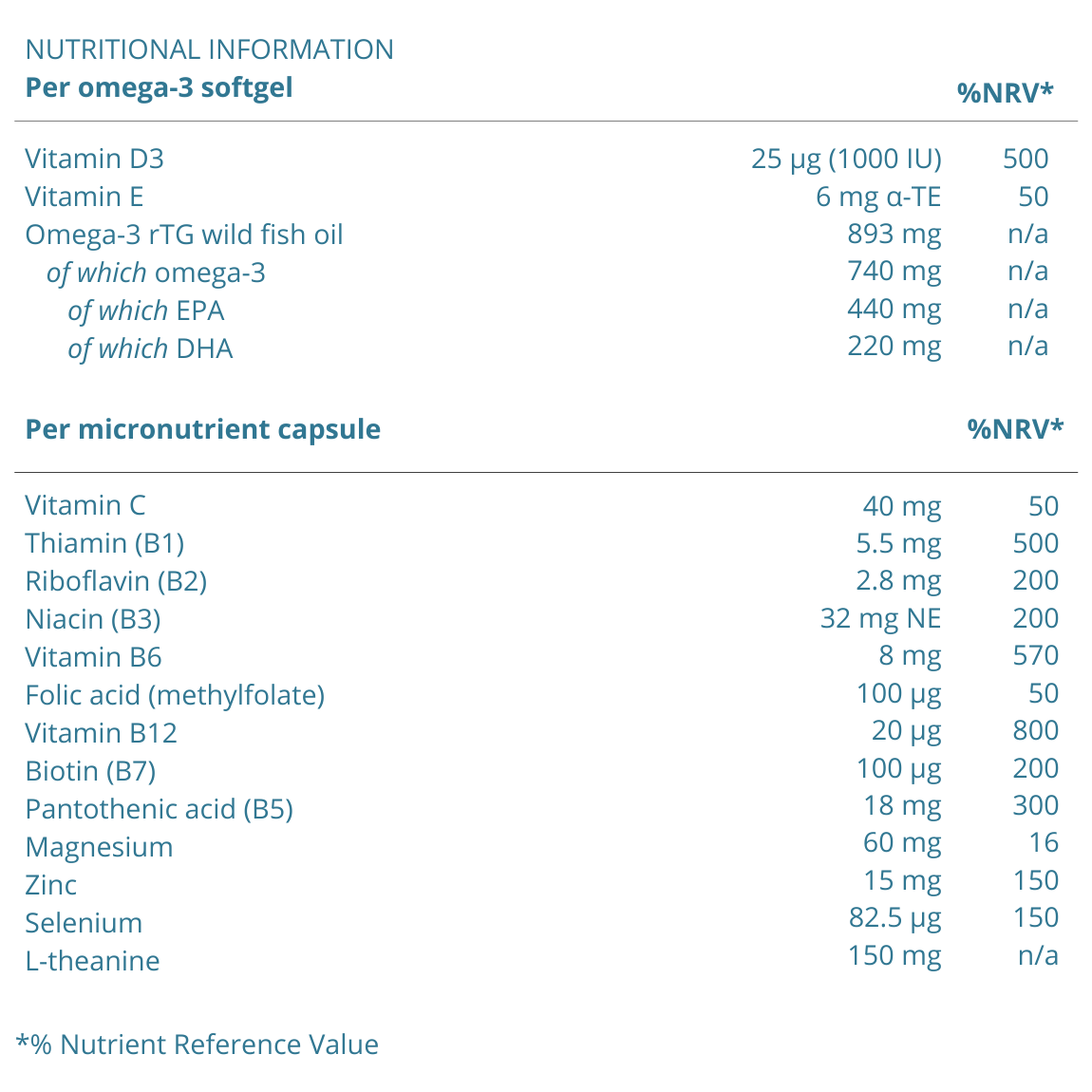Each box contains 30 omega-3 softgels + 30 micronutrient capsules, providing a 1-month supply at a daily dosage of 1 softgel & 1 capsule.