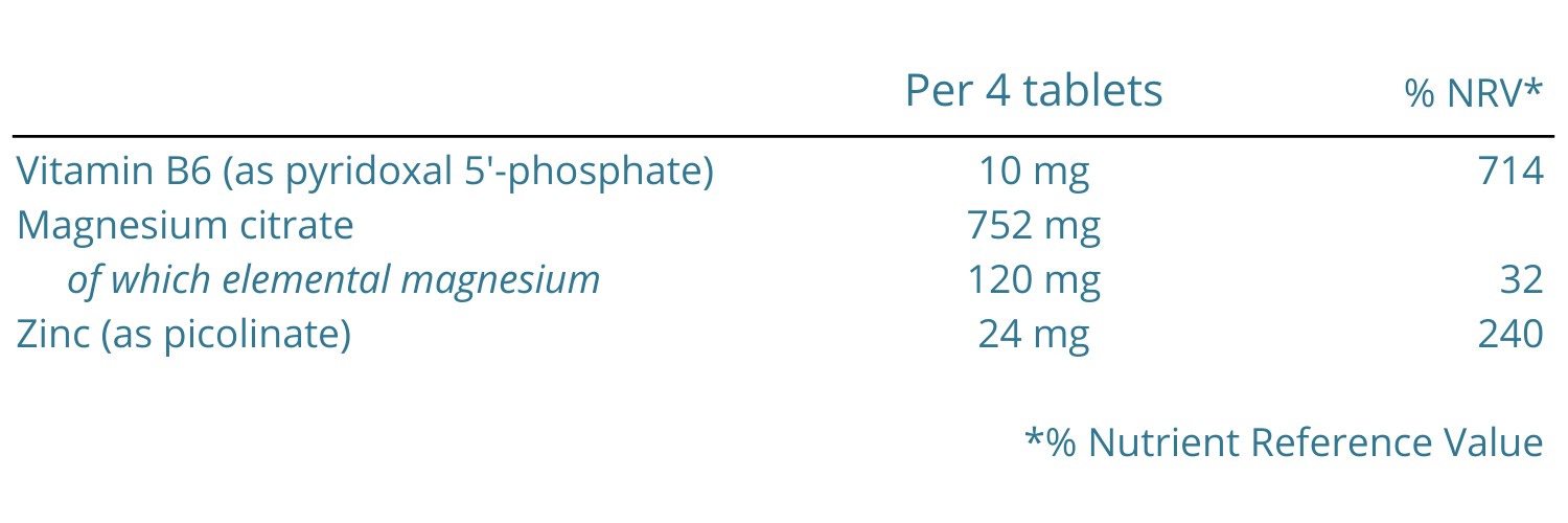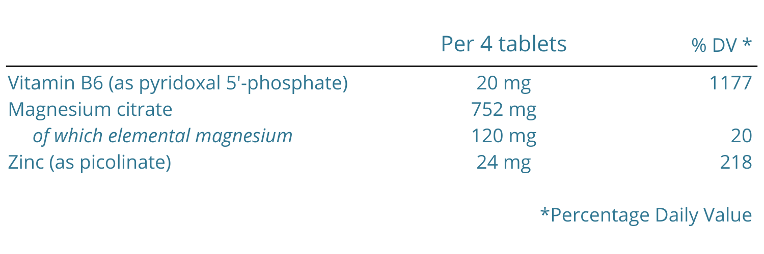 Ingredients: Magnesium citrate; bulking agents: microcrystalline cellulose, acacia gum, hydroxypropyl cellulose; zinc picolinate; anti-caking agent: ascorbyl palmitate; vitamin B6 (pyridoxal 5'-phosphate); glazing agents: hypromellose, glycerol.