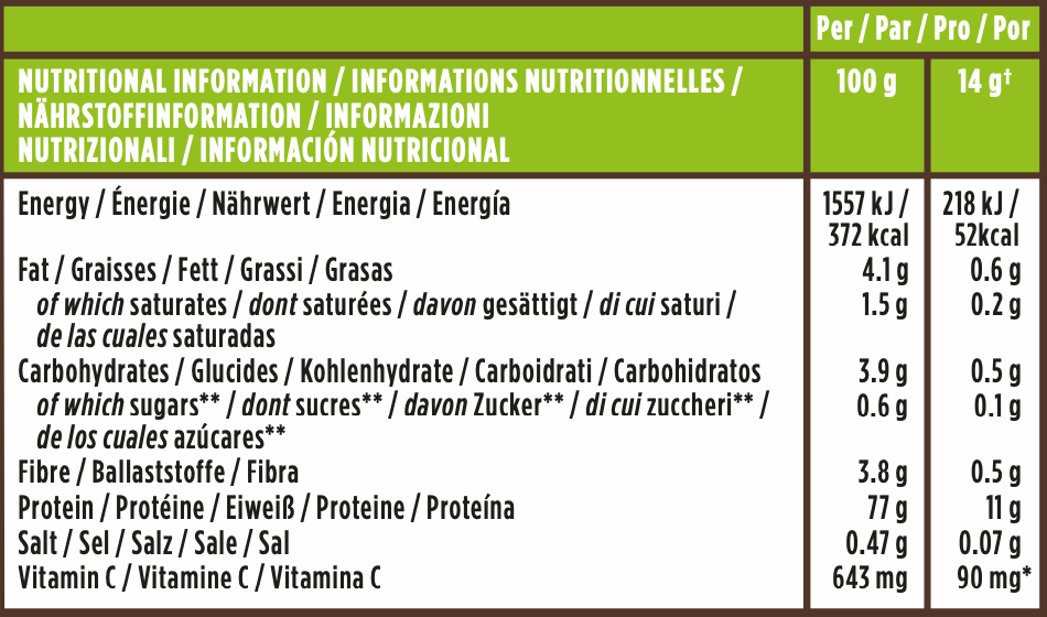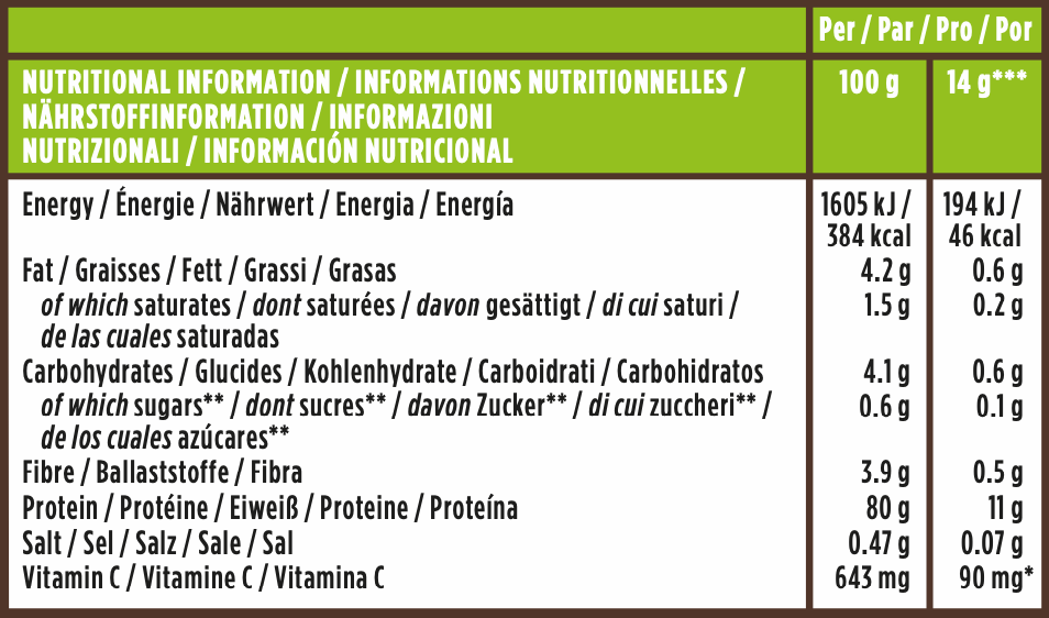 Vegan Pro-Collagen is a complete nutritional package, supplying the key building blocks for collagen formation – the correct collagen amino acids at ideal ratios, sufficient protein, and collagen co-factor vitamin C. This unique vegan protein powder is the first of its kind to mirror the amino acid profile of collagen, enriched with precise ratios of hydroxyproline, proline and glycine – the most abundant amino acids in collagen. Each serving offers 11g of protein, from a total of 21 broad-spectrum amino acids – with more essential amino acids than standard collagen supplements, and added vitamin C as the co-factor to promote collagen synthesis and protect against collagen degradation.